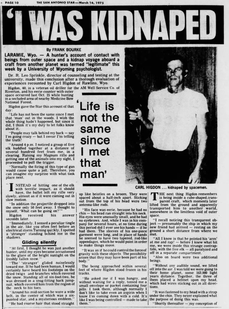 Margery Higdon, Carl’s wife, is the author of Alien Abduction of The Wyoming Hunter: First person story of Carl Higdon